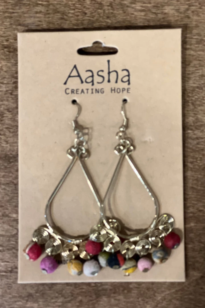 “Aasha” means hope in Hindi. Aasha is a 100% sustainable jewelry line made by an artisan group of economically disadvantaged women. Using discarded saris and wrapping them over small wooden beads these women are able to create a very unique and colorful collection of jewelry. The wooden beads are scraps sourced from furniture factories nearby, and the fabric used to cover them comes from old, worn saris, collected all over India! No two beads will be the same.