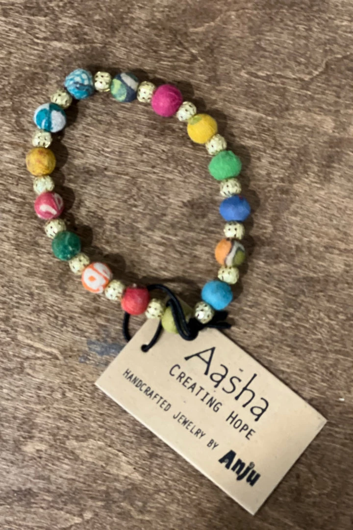 “Aasha” means hope in Hindi. Aasha is a 100% sustainable jewelry line made by an artisan group of economically disadvantaged women. Using discarded saris and wrapping them over small wooden beads these women are able to create a very unique and colorful collection of jewelry. The wooden beads are scraps sourced from furniture factories nearby, and the fabric used to cover them comes from old, worn saris, collected all over India! No two beads will be the same.