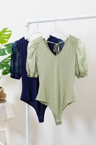 Gorgeous navy blue bodysuit with scoop neckline, short puffed sleeves that are sheer, and gold polka dot detail! Need we say more?