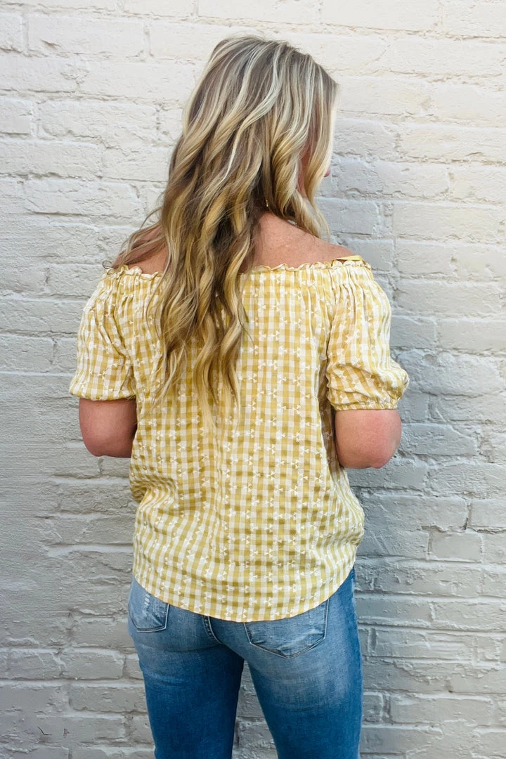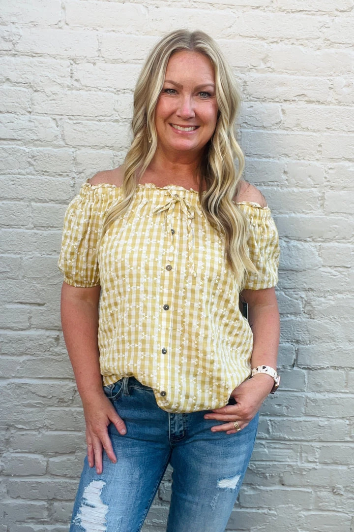 Gingham checked doesn’t get any cuter! This short sleeve top features an off shoulder neckline, front tie, and buttons.