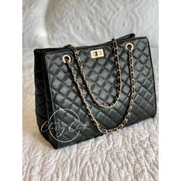 The Kelly Quilted Shoulder Handbag has a wide base, beautiful soft quilted faux leather, and a textured chain intertwined with the same fabric the bag is made with. It takes texture to the next level, while providing ample space inside for all the things! 4 Gold eyelet holds on each side allow for the purse to close tight when the chain strap is either doubled for carrying like a handbag or pulled tight through one side to extend as a long shoulder bag. Metal clasp closure secures the top!