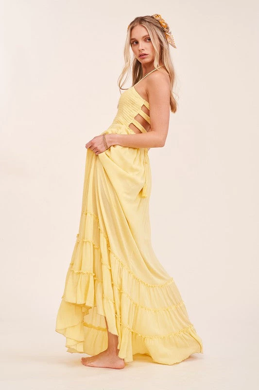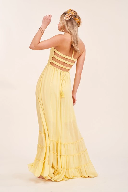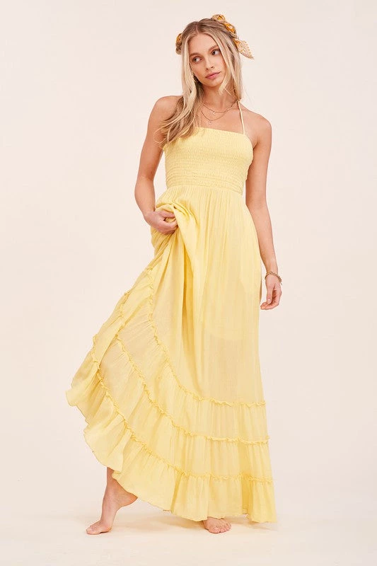 - Feminine woven maxi dress - Halter strap ribbon tie on neckline - Smocking on the front bust - 3 bold elastic band strap on center back for easy wear with self ribbon tie on waist band - Ruching on bottom skirt - Tiered layer on bottom skirt with ribbon detail - Finished with clean hem - Lining inside - Model is 5' 8" 34-25-35.5 and wearing a size Small