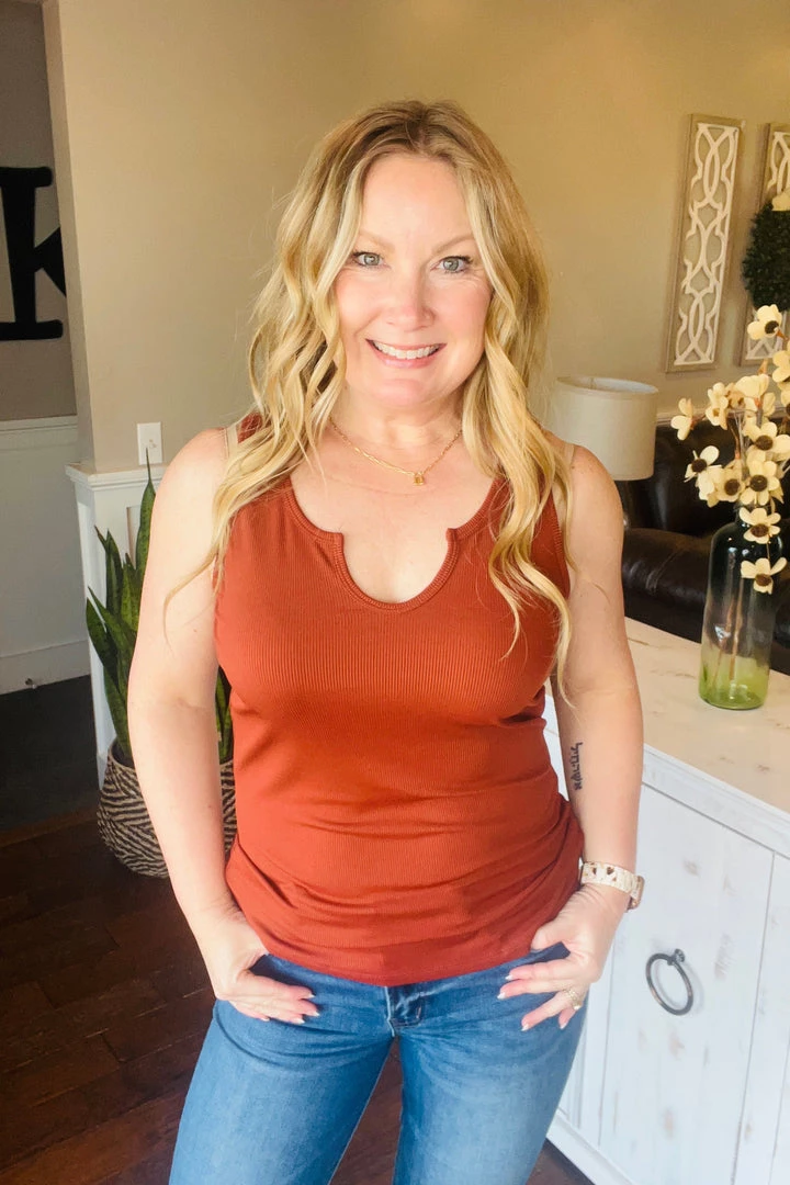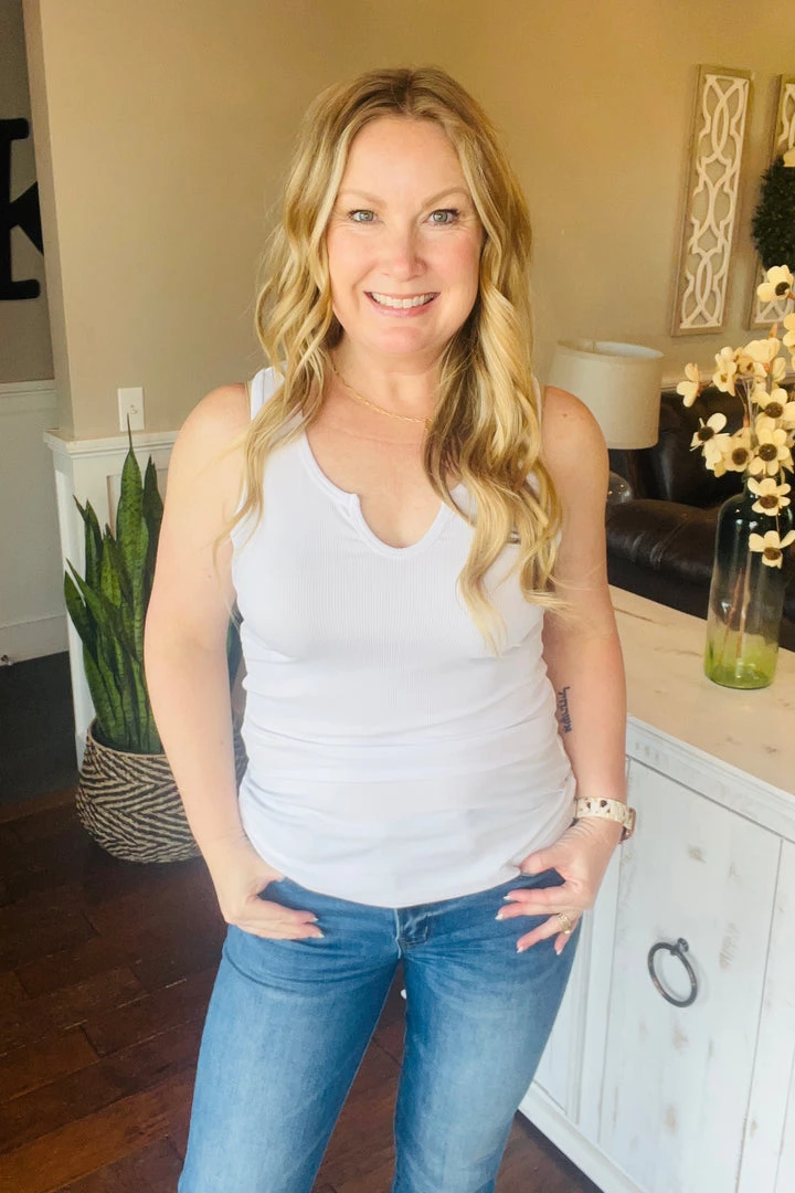 This tank has a split neckline, slim fit silhouette and sleeveless design.