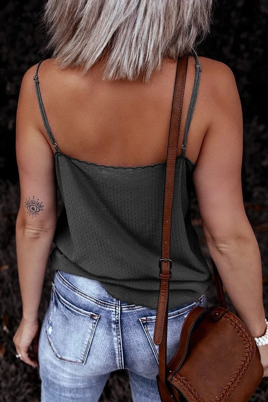 The best everyday cami for summer days or layer. The design includes a crochet v neck, spaghetti straps and flowing silhouette.
