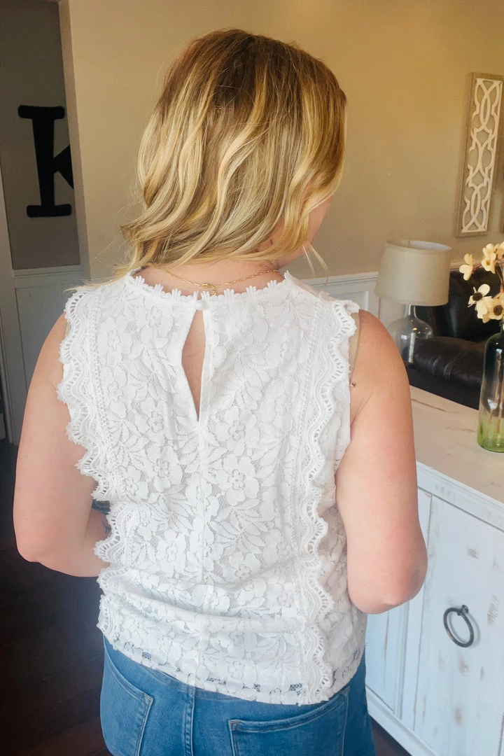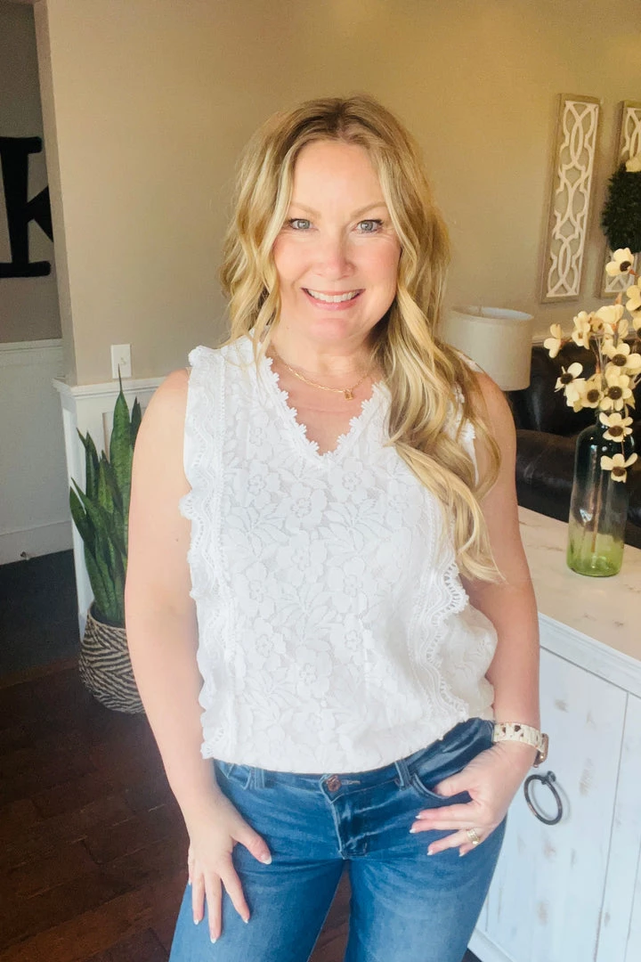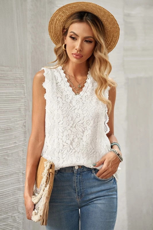 This delicate lace tank top is such a beautiful piece for summer! Made with floral lace fabric, the v neck line, full lace back, and scalloped lace trim.