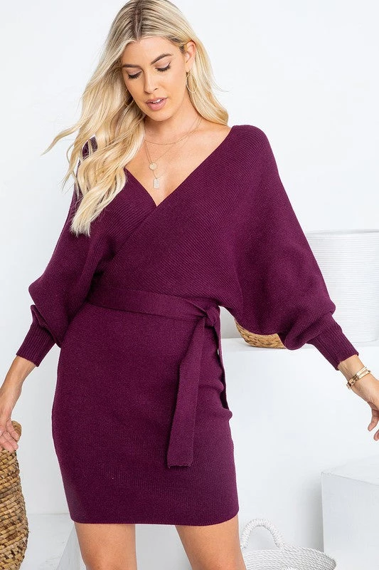 Sweater surplice bodice dress with self tie belt. Creates a feminine look . This dress is incredibly comfortable, effortless styling options. -Feminine Look -Sexy Wrap V neck front and back Top -Long Batwing Sleeve -Made with soft sweater fabric ad comfortable to touch and wear -Stretchy fabric