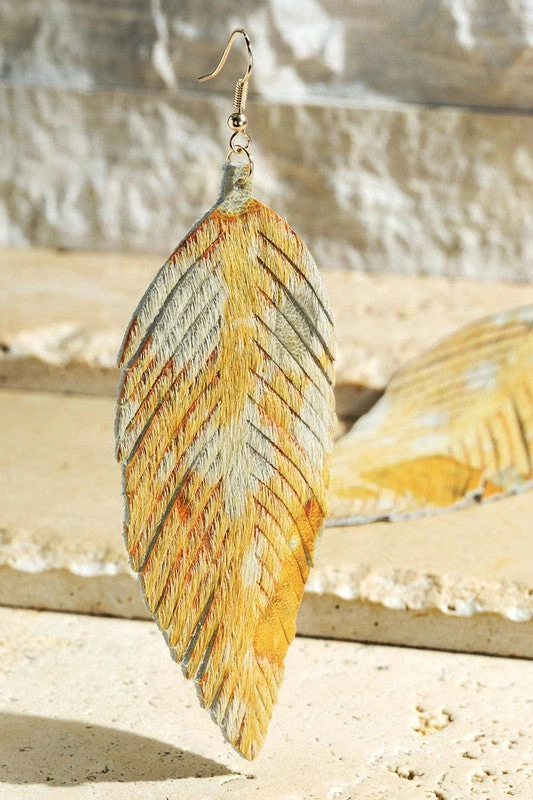 Beautiful stylish animal print leather inspired leaf shape dangle earrings *Genuine leather *Nickel/Lead Compliant *APPROX. L 4″ W 2″