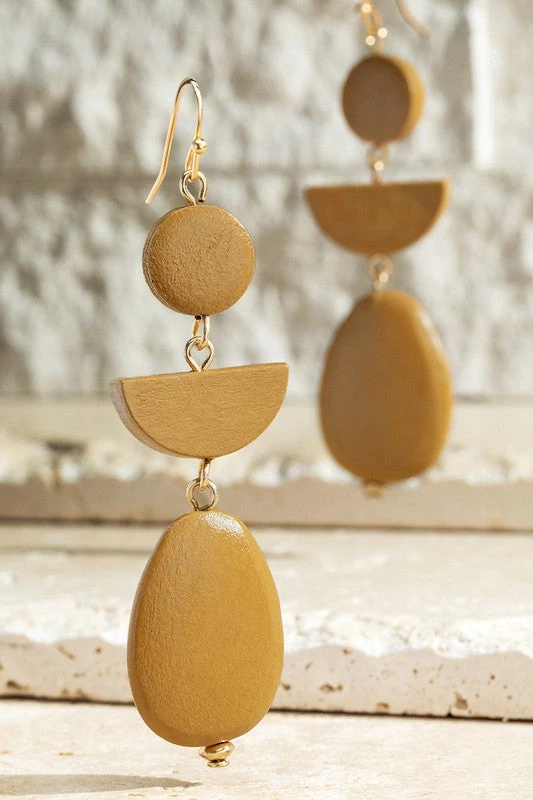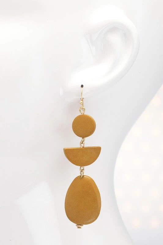 Beautiful three tier geometric shaped wood dangle drop earrings
