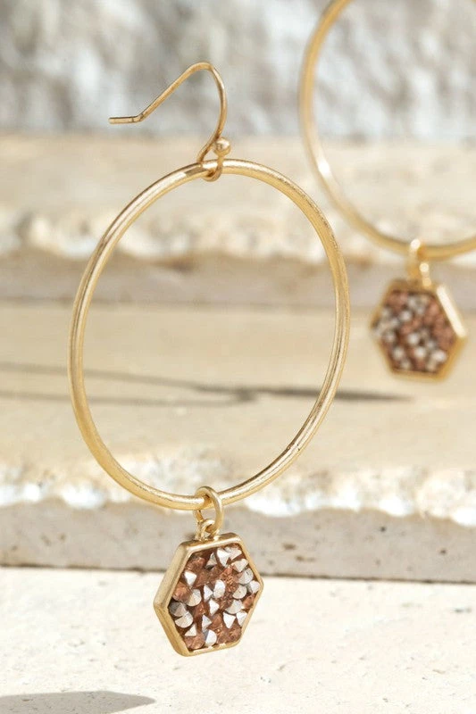 Glamours shimmery glittery glass stone charm and metal worn wire hoop dangle earrings