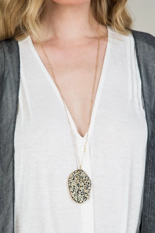 Stylish natural stone pendant and metal chain long necklace with lobster closure *Glass, Metal, Natural Stone *Nickel/Lead Compliant *APPROX. L 31.50″ EXT 3.50″ Pendant L 2.50″ W 1.50″