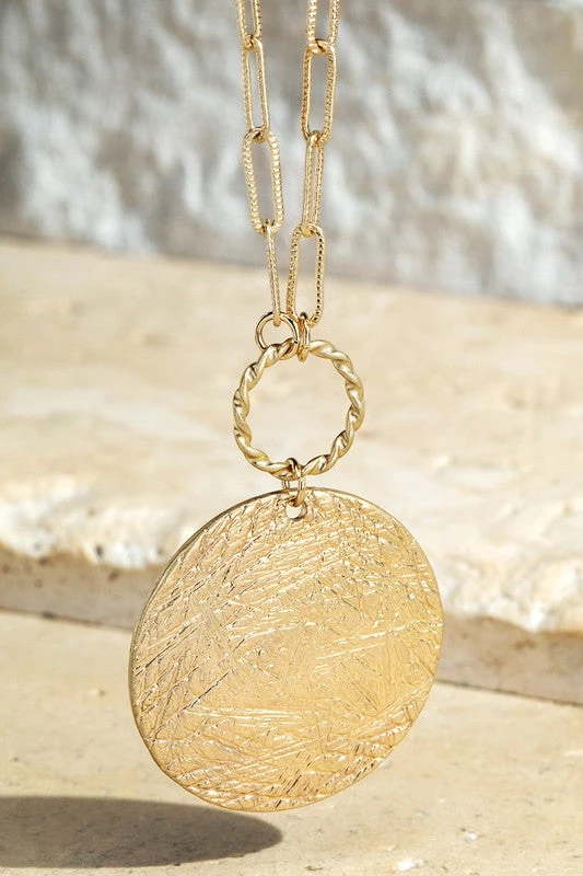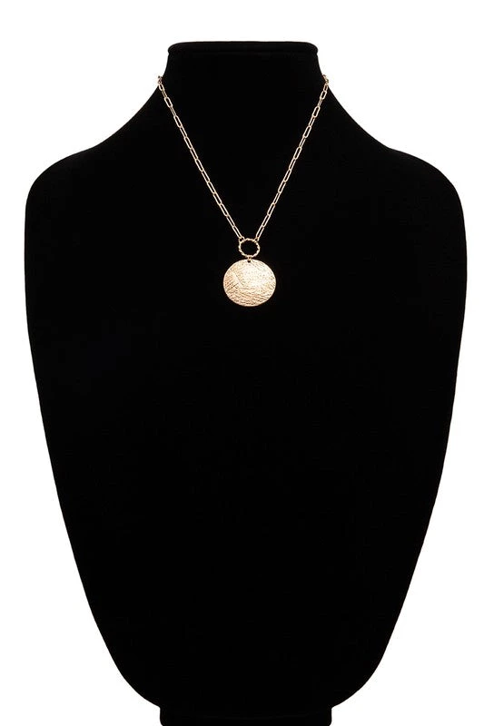 Charming metal textured with worn effect round pendant and short linked chain necklace