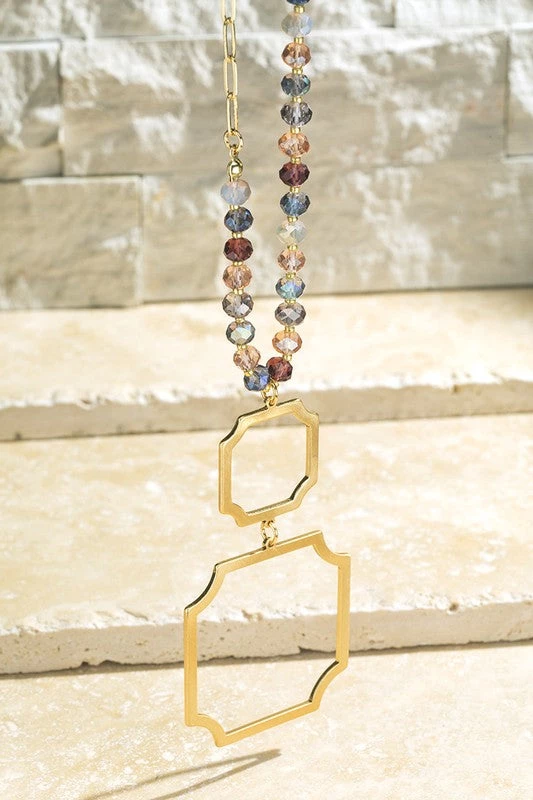 Stunning geometric pendant with 6mm glass beads along the link chain long necklace *Glass Bead, Metal *Nickel/Lead Compliant *APPROX. L 33″ Ext 3.25″ Pendant L 3″ W 1.75″