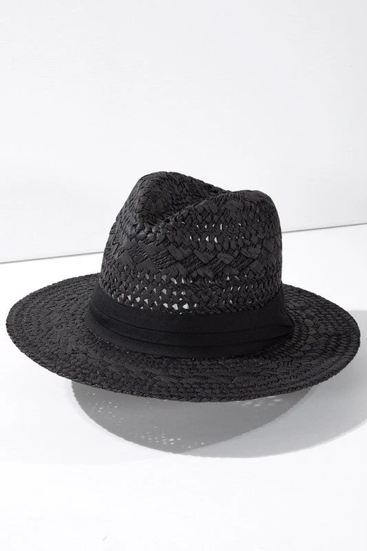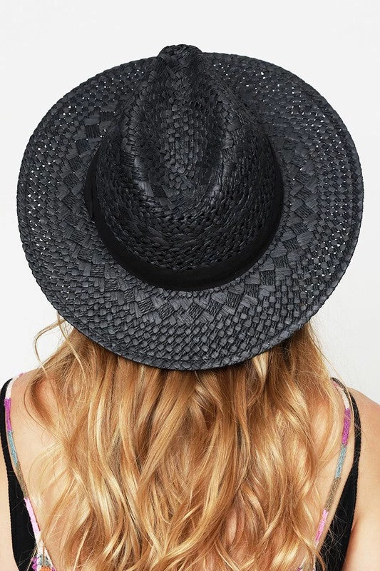Panama hat with black tucked ribbon with patterned weave accent *APPROX. Circumference: 22" Brim: 3" Crown Height: 5.25"