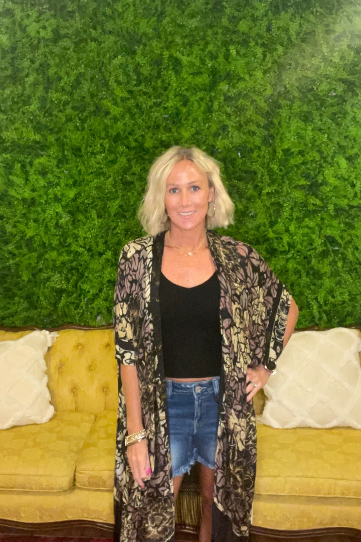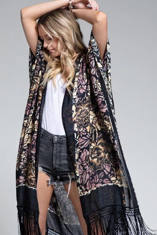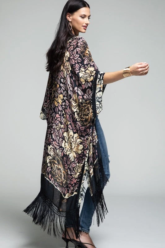 Gorgeous intricate floral motif with border featuring a silky tassel kimono with side slits *100% Viscose APPROX. L 46" W 39"