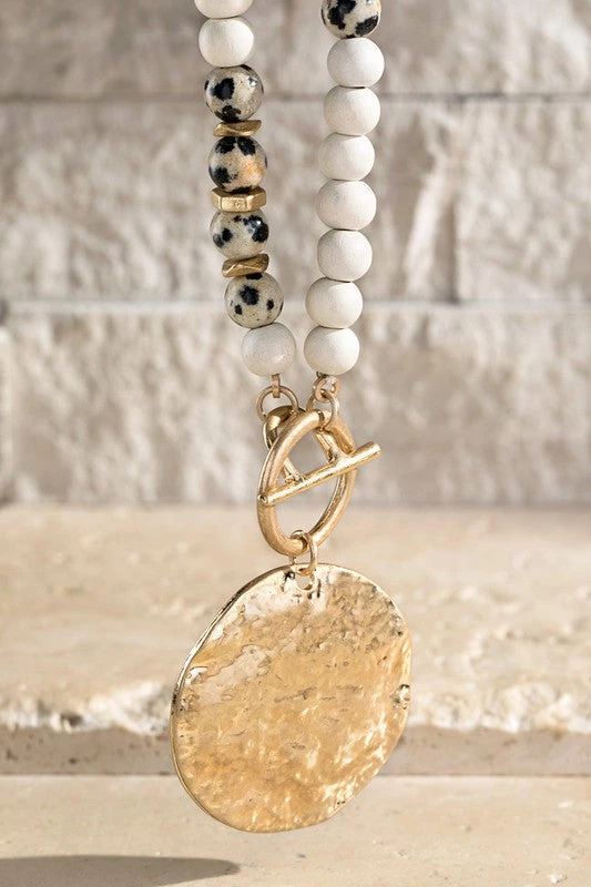 Dazzling hammered metal round disc pendant and mixed wood, metal with natural stone beads short chain and metal toggle closure *APPROX. L 21″ Pendant Diameter 1.50″ *Nickle/Lead Compliant