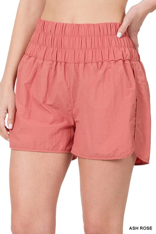 WINDBREAKER SMOCKED WAISTBAND RUNNING SHORTS – MESH WAIST POCKET – SPLIT HEM – BUILT-IN INNER BRIEF – RELAX FIT